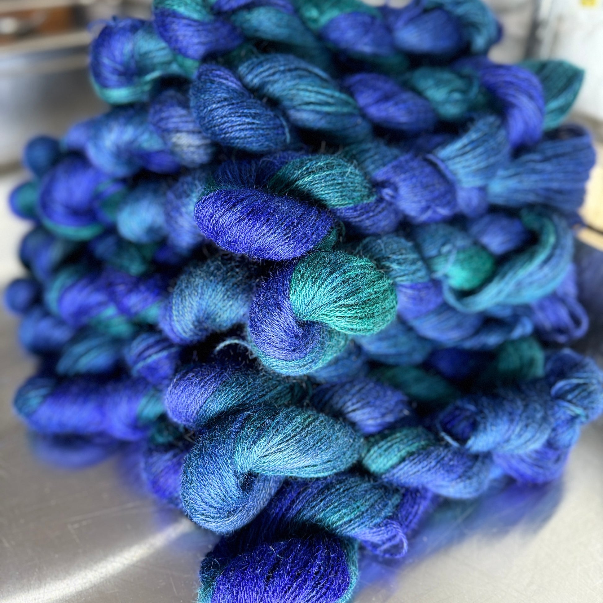 This beautiful Gotland wool is from a small flock farmed in North Highlands of Scotland , processed in Yorkshire and hand dyed at Worden Park, in Leyland, Lancashire.