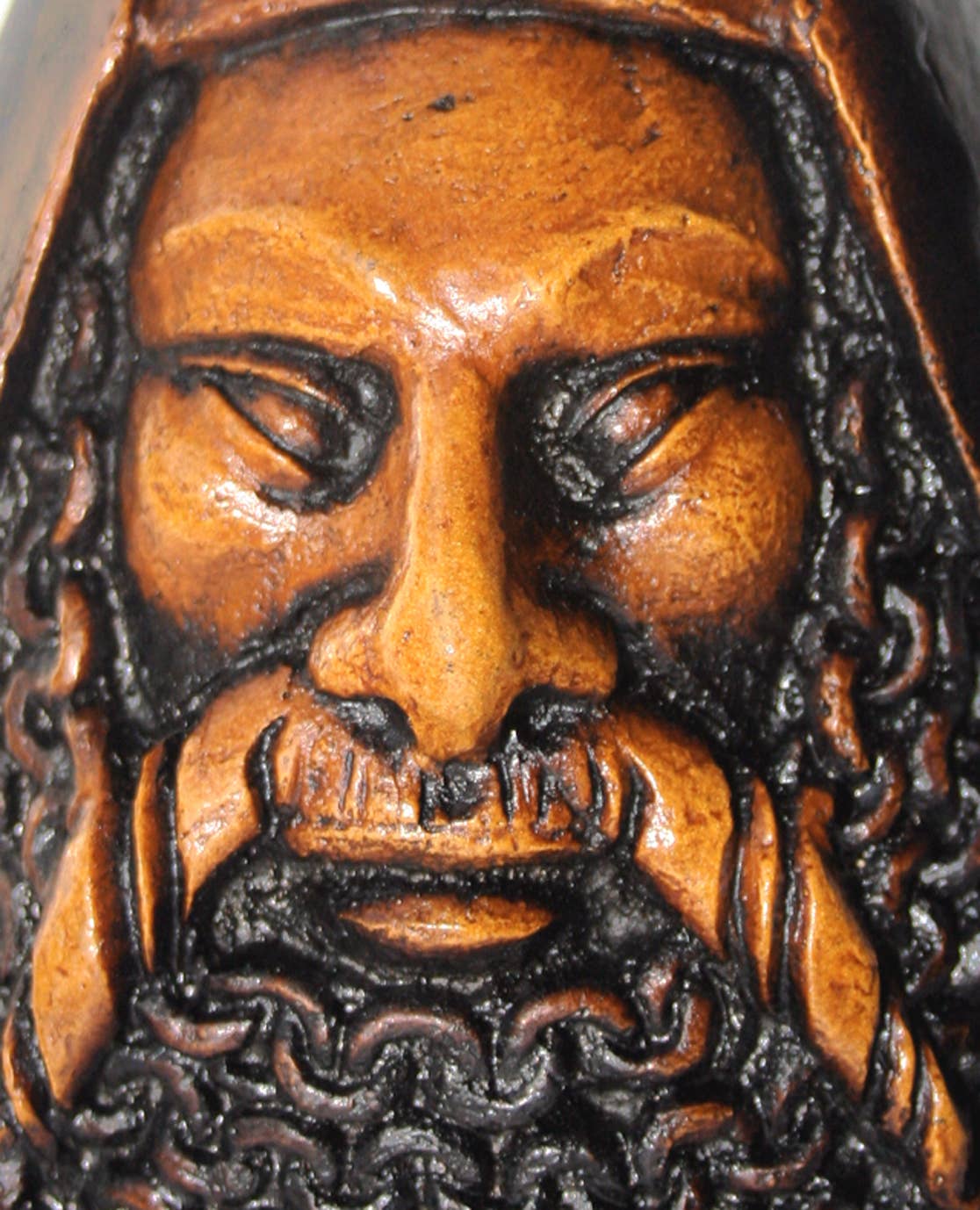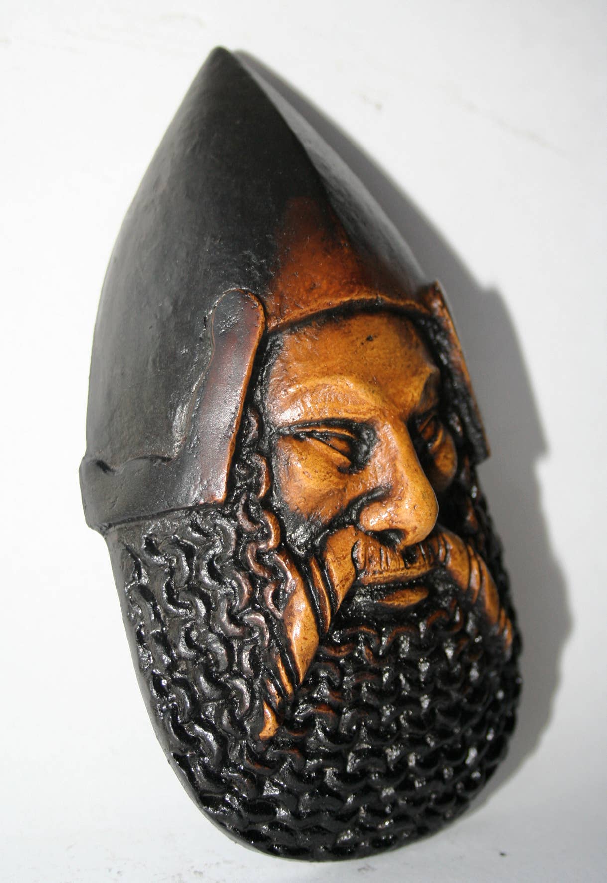Taken from the carvings found upon the misericords within the choir stalls of Lincoln Cathedral, England. This carving is of an early medieval Knight’s Head wearing a pointed helmet but mainly protected by chain mail. He is a fierce looking warrior with a long moustache protruding over his chain mail. This is a magnificent carving and reproduced with all the fine and splendid detail of the original carving.