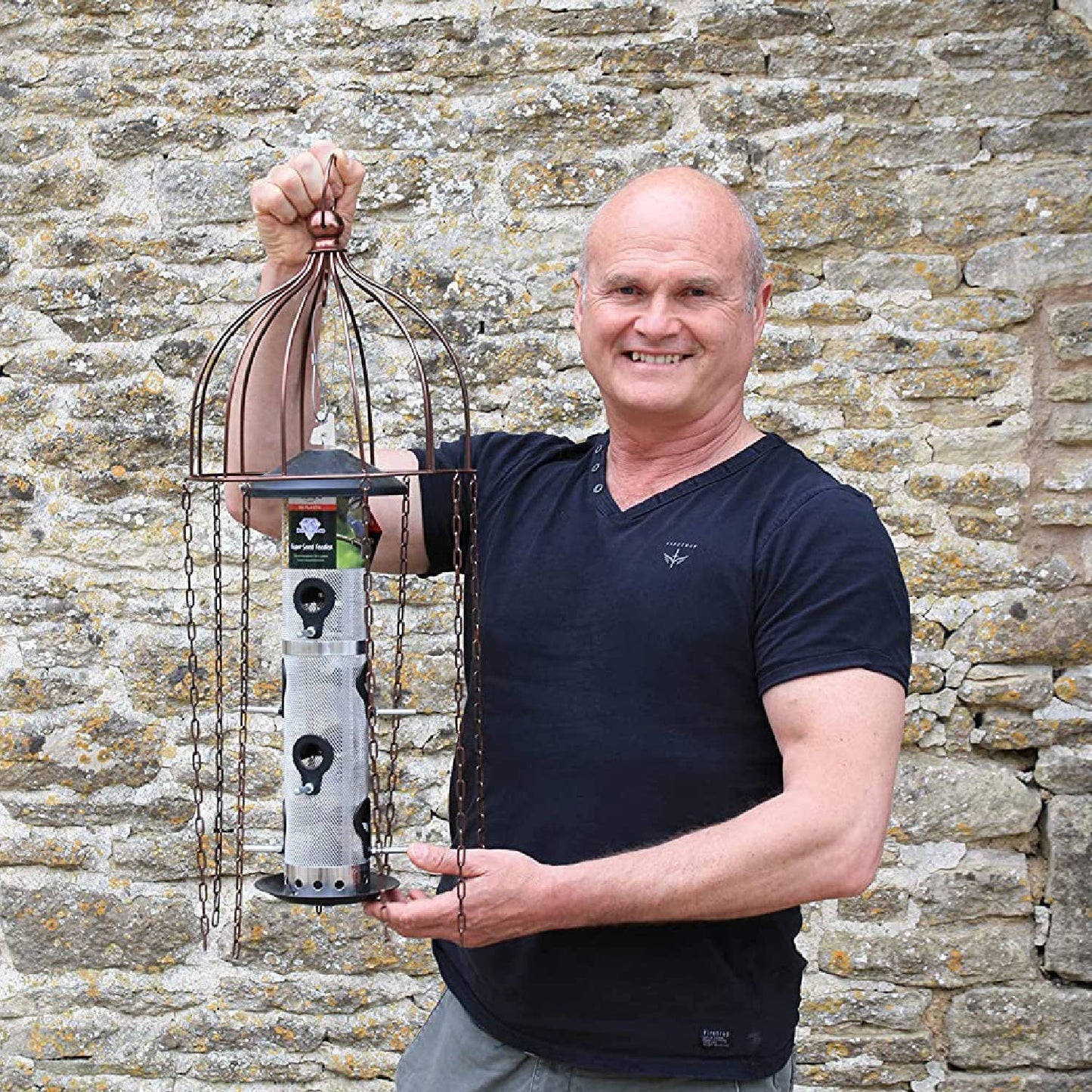 Designed by Simon King The Medusa Feeder defender is a Bird Feeder Protector that is perfect for small birds but discourages larger birds (Jackdaws / Rooks / Pigeons Magpies etc). Some bird species, such as these larger birds can clear out a seed feeder in a single morning, leaving nothing for the smaller bird species that visit your garden. It has been designed to work with a wide variety of hanging feeders. Site the Defender... as you would a hanging bird feeder - away from nearby obstructions such as tree branches or bushes. Then hang your cylindrical seed, nut or fat feeder from the hook on the lower inside lid of the defender. For the defender to be most effective, ensure the bottom of your feeder does not hang lower than the bottom of the dangling chains. After a short while, the smaller birds that visit your garden will learn to comfortably flit between the hanging chains It will not defend against starlings (which need support) or that sized bird